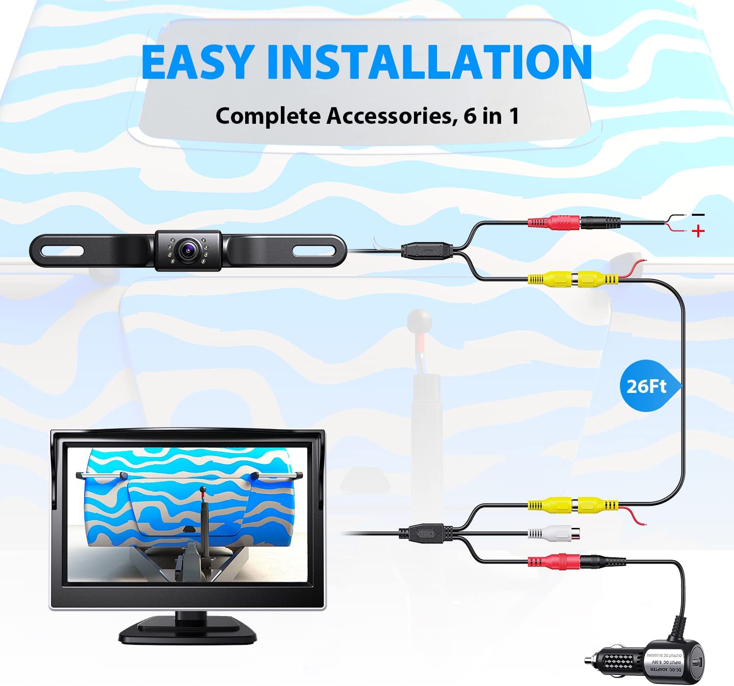- ►Conexión sencilla: La cámara de visión trasera se conecta mediante un cable de vídeo de 26 pies al monitor. Dos maneras de alimentar la cámara de marcha atrás: conectarla a la luz de marcha atrás para su uso al aparcar, o a una fuente de alimentación de 12 V para su uso continuo durante la conducción.