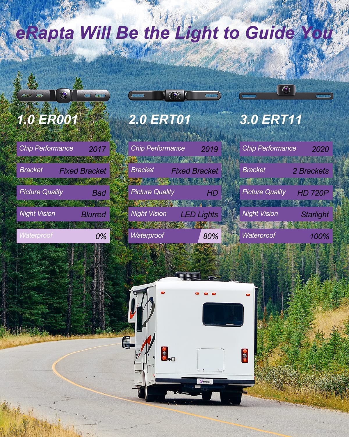 - 【HD 720P y visión nocturna Starlight】La cámara de respaldo eRapta 3.0 está equipada con una impresionante resolución de alta calidad de 720P (1280x720) utilizando el último chipset de 2021. Con sensores de imagen Starlight integrados, esta cámara de visión trasera le ofrece una visión nocturna más clara sin distorsión de la imagen.