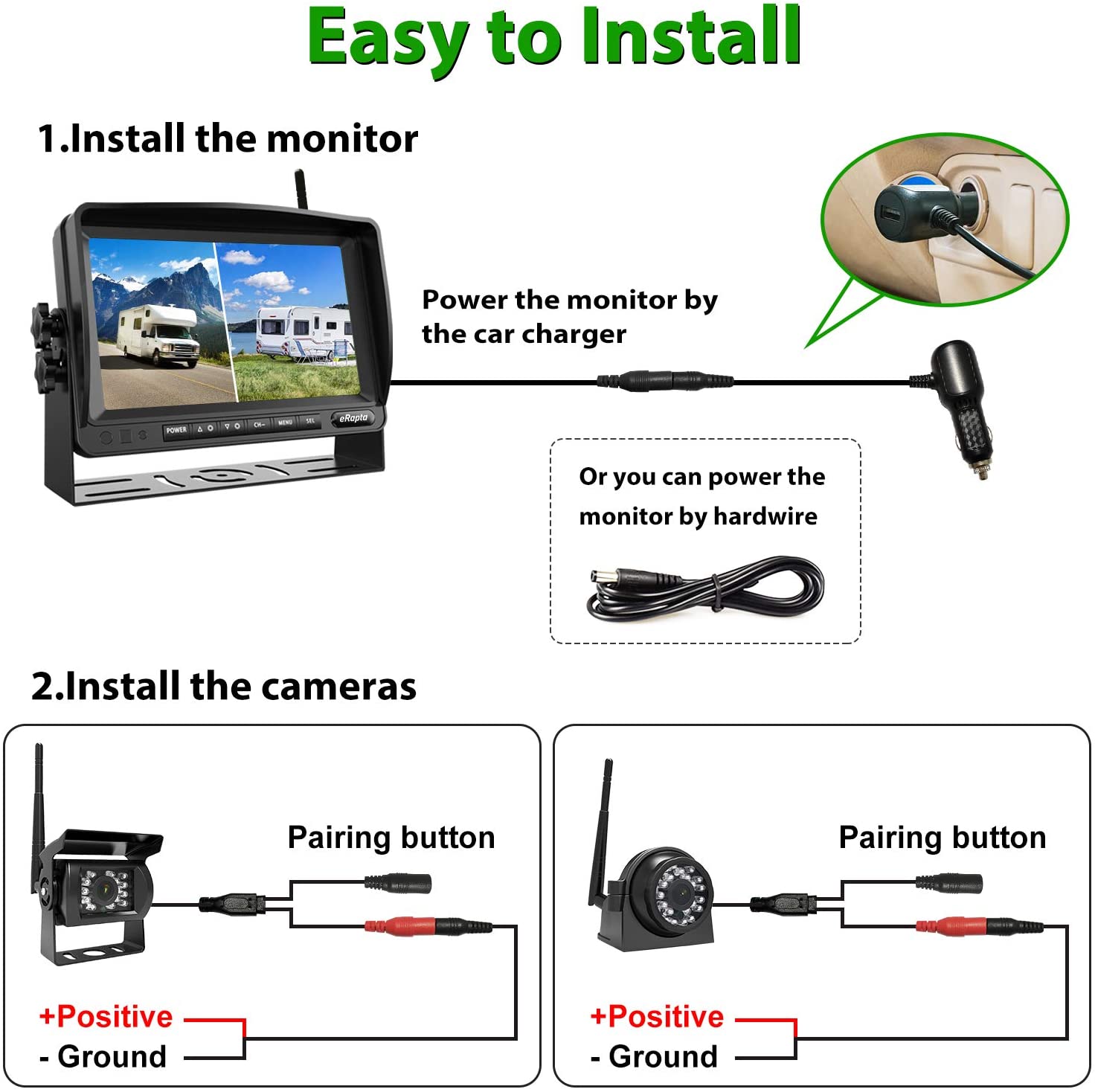 - Imagen AHD 1080P. Esta cámara de visión trasera inalámbrica digital, equipada con 16 luces infrarrojas y sensor CCD, muestra imágenes en alta definición de hasta 1080P. La tecnología avanzada eRapta asegura una visión nocturna superior. Puede reconocer con precisión el color del césped y las piedras a una distancia de hasta 50 pulgadas, incluso en la oscuridad.