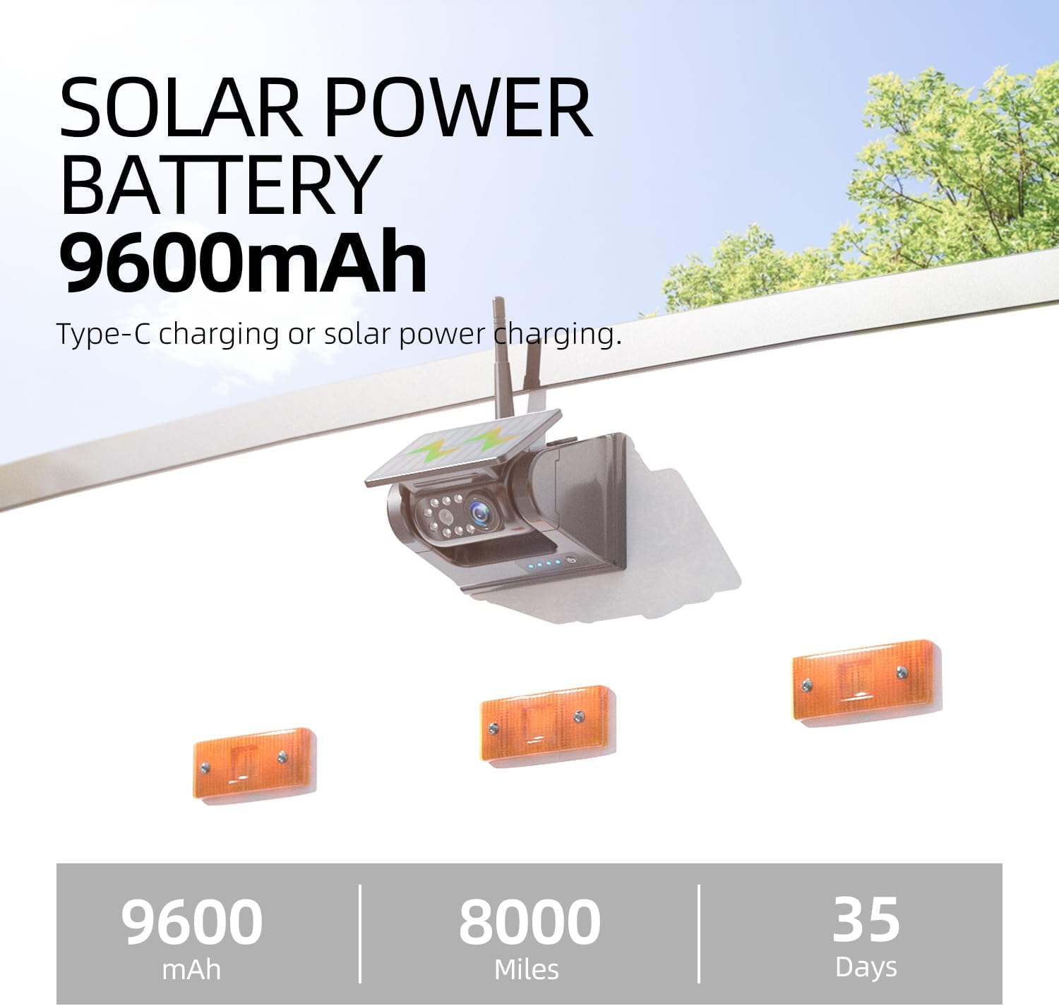 - Gran capacidad y energía solar: Con una batería integrada de gran capacidad de 9600 mAh y equipado con un panel solar, la cámara adopta un diseño inalámbrico, utilizando carga tipo C y energía solar para prolongar el tiempo de funcionamiento.