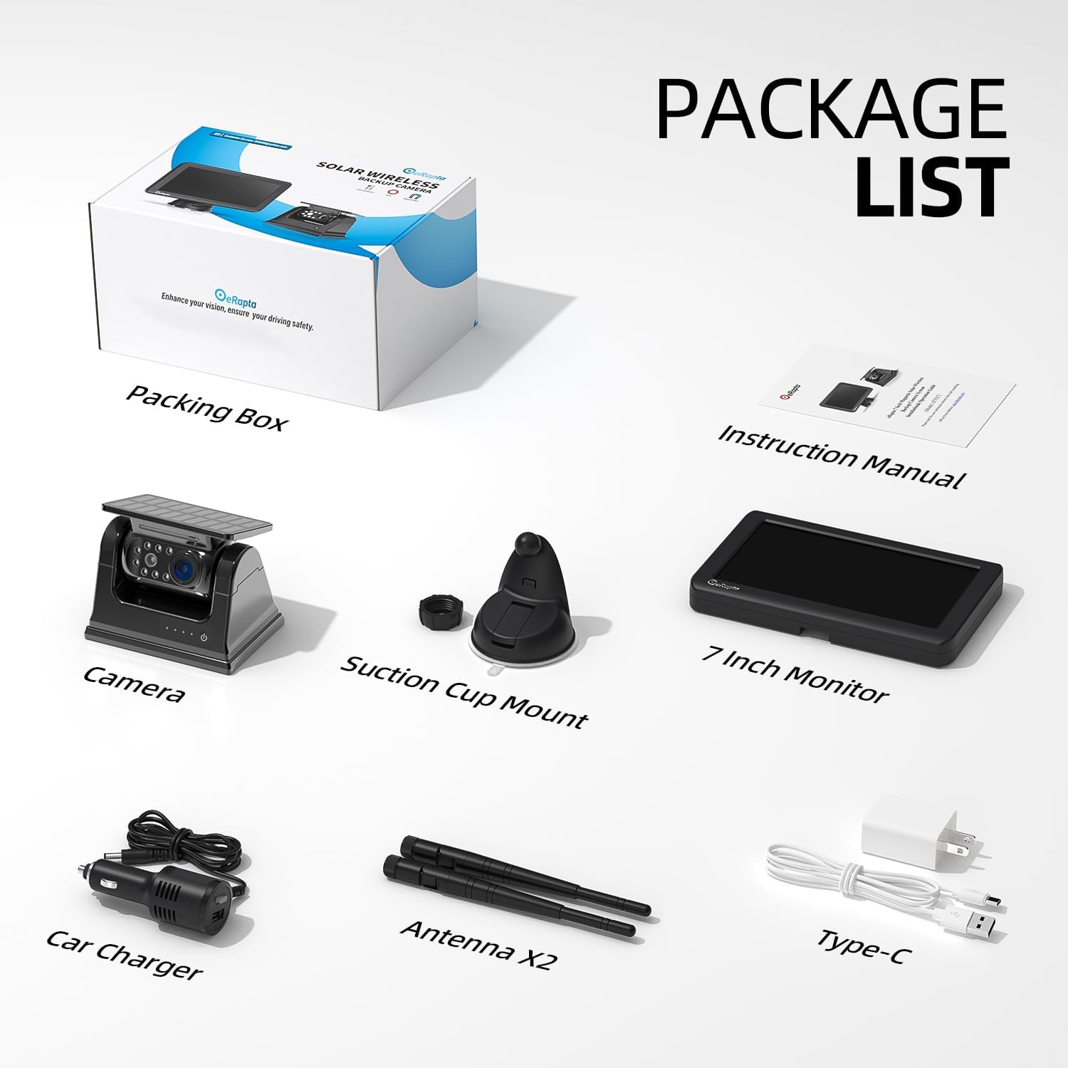 Cámara de visión trasera inalámbrica solar magnética eRapta con monitor de 7" y 1080P, instalación en 1 minuto, DVR de 4 canales, sistema de cámara de marcha atrás recargable para caravanas, remolques, coches, autocaravanas, camiones y vehículos ATYX7.