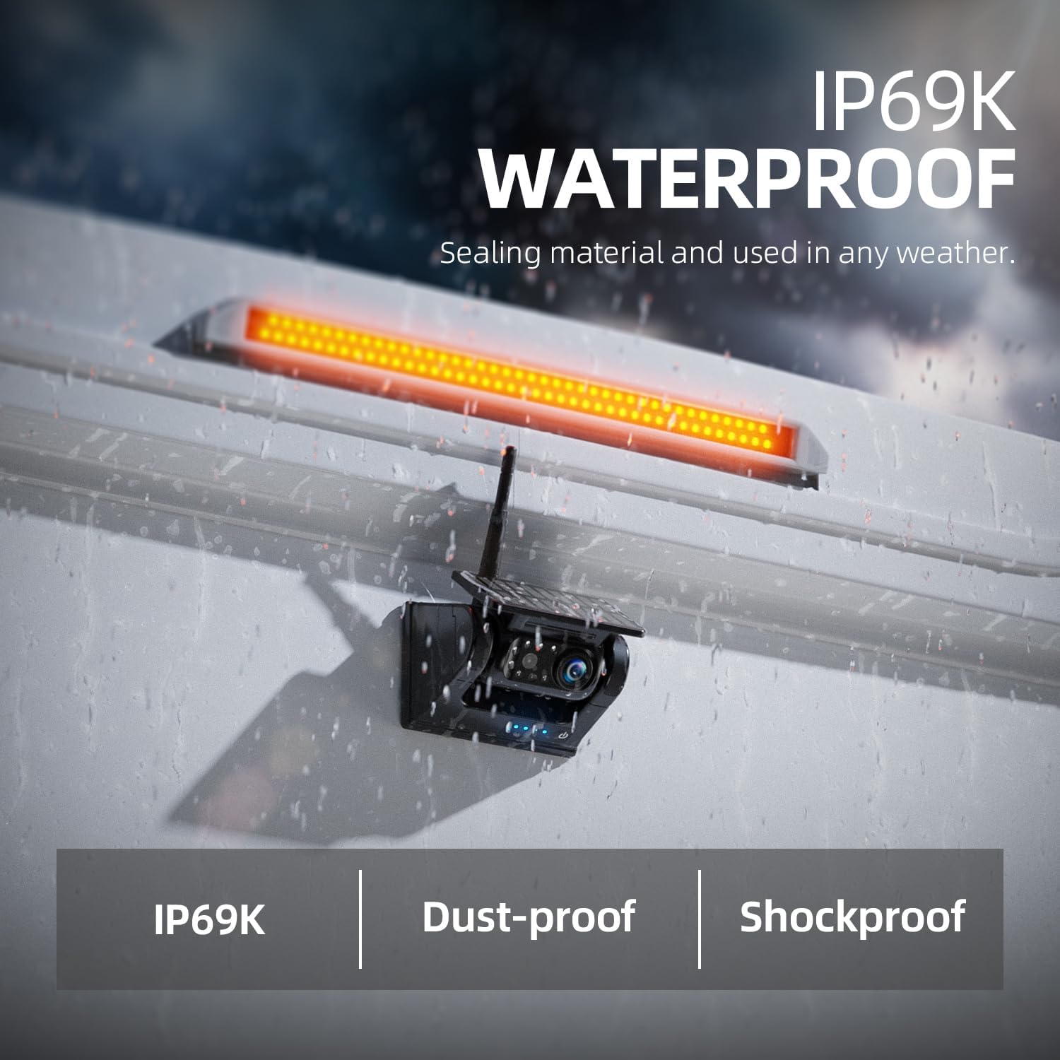 - Resistente al agua IP69k y ángulo de visión amplio: La cámara está fabricada con materiales impermeables de alta calidad y cuenta con un puerto de carga sellado. Soporta temperaturas que van desde -21 °C hasta 66 °C. Con un ángulo de visión amplio de 150°, podrá tener una visión más clara y amplia de las condiciones de la carretera, evitando puntos ciegos.