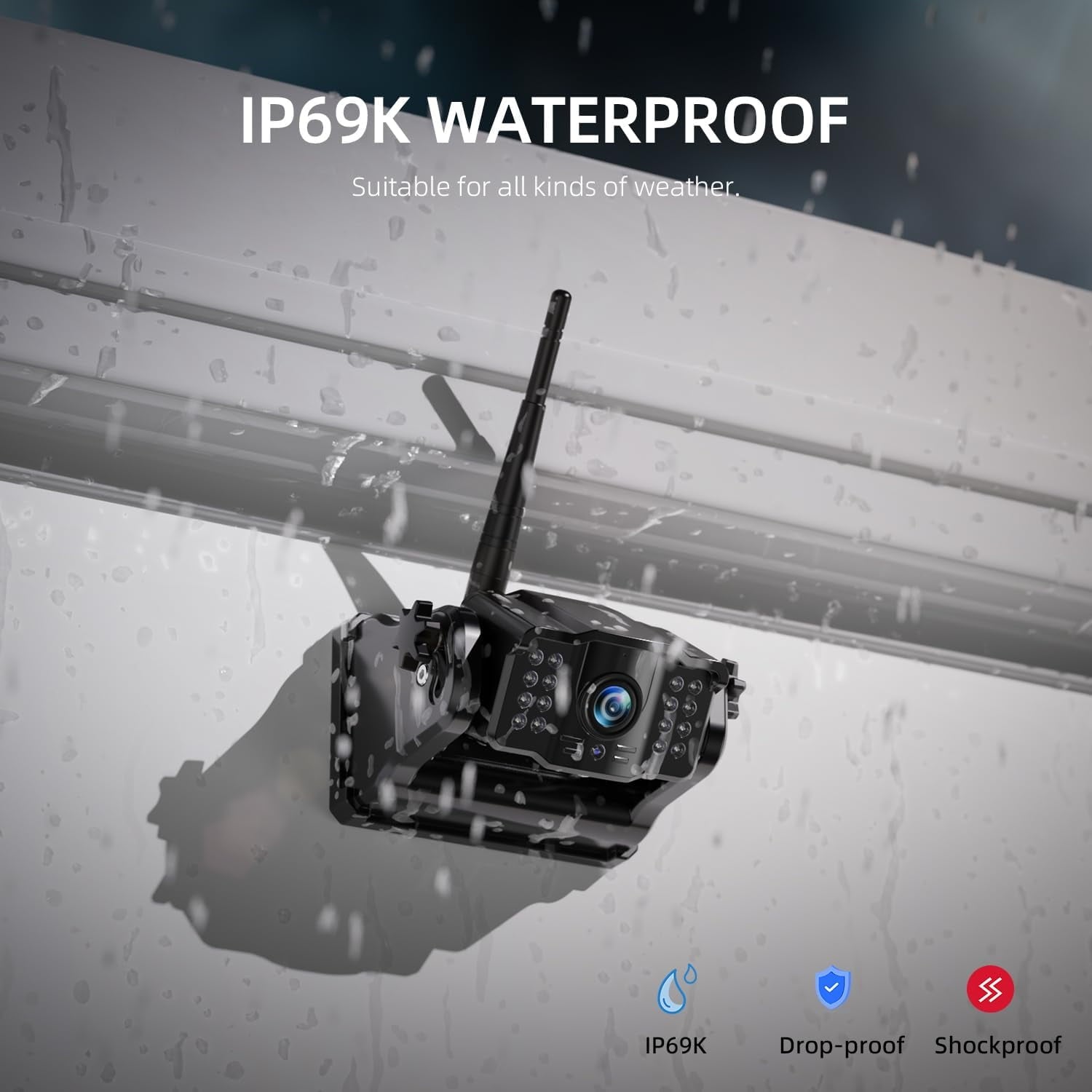 Resistente al agua IP69k y ángulo de visión de 150°: La cámara está fabricada con materiales impermeables de alta calidad y cuenta con un puerto de carga sellado. Soporta temperaturas que van desde -21°C hasta 66°C. Con un diseño de tornillo de ángulo ajustable, la cámara puede ajustar el ángulo requerido según sea necesario, para que pueda tener una visión más clara y amplia de las condiciones de la carretera, evitando puntos ciegos.